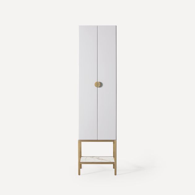 Recalling the golden days of Hollywood, the Claudette collection pays homage to the glamourous and sophisticated interiors of the silver screen. Two show-stopping designs of the Claudette collection, are the fluted marble vanity and an accompanying 80-inch-high Linen Cabinet. The creamy, multi-layer painted white lacquer cabinet is centered by a slightly oversized circular Brass-painted pull and supported by stainless steel legs that are joined in a box stretcher and finished in Brass.