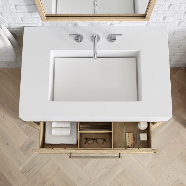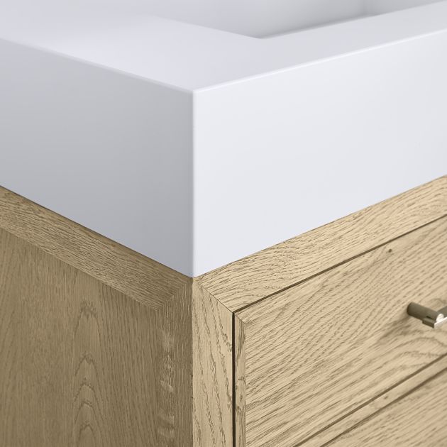 • Modern Scandinavian design gets a traditional twist with brushed pewter hardware, Shaker-inspired mitered detailing, Integrated mineral cast basin sink with removable drain design and solid wood construction in a rustic light oak finish.