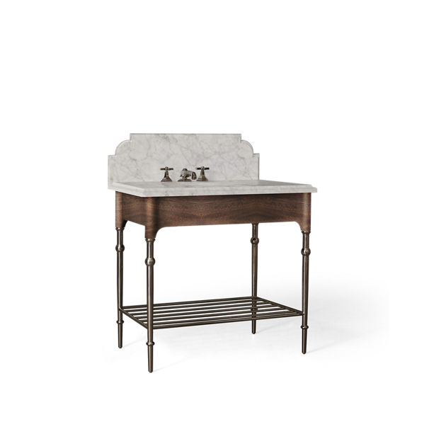The Stanwyck collection is a masterful mix of materials and forms, paired with deco-inspired details. The vanity, created exclusively by Robern, features an impressive 10-inch sculptural marble backsplash, offered in 36-inch or 56-inch widths, and decorated with an ogee edge detail. A marble top, available in four premium stones by Ann Sacks, sits upon an oak veneer apron above a hand-welded, solid steel base.