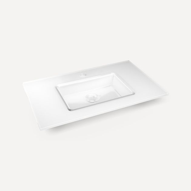 • Our stunning glass top features a rectangular integrated sink, without overflow, in a 19/32" thickness. Our quartz stone tops feature a white rectangular sink, with overflow, in a 3/4" thickness.